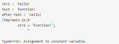 test2 함수에서는 재할당으로 전역변수인 str1에도 영향을 주는 것을 볼 수 있다.