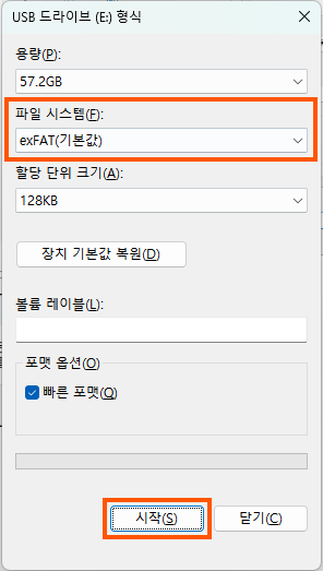2. 파일 시스템에서 'exFAT' 선택 > '시작' (1초면 안료됩니다!)